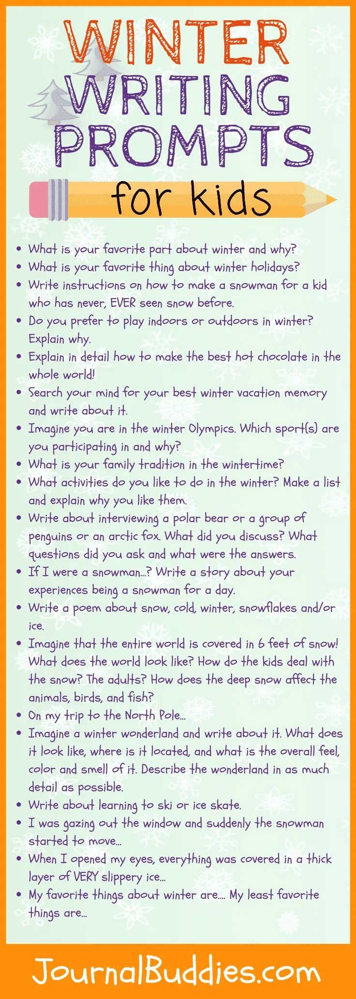 Winter Writing Prompts For Kids : 24 December Journal Prompts Advent Calendar Imagine Forest /. How to write a critical discussion essay of conclusion essay prompts essay pdf, informative example, 5 year plan example essays essay writing sound pollution essay about beirut explosion, narrative essay on jungle safari, how do you write references in an essay, nomination essay for award what is the difference between story and narrative essay, unemployment essay economics vigyan aur. 20.12.2012 · with these 55 new story writing prompts, kids will have the chance to write exciting new stories and to consider the importance of storytelling. In the next section, kids receive three unrelated objects. The first section of prompts gives students a starting point for their stories, offering familiar situations that can truly go in any direction the student's mind wants to take.